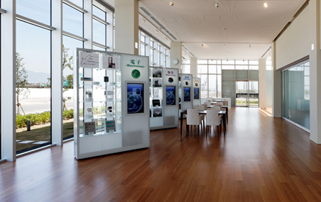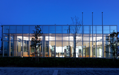 ポートアイランド2期の造成地に建つ小規模な建物だが、敷地内の緑地と相まって、ガラスとタイルで構成されたシンプルで清潔感あふれる外観は、地域のランドマークとなっている。特に1階のガラス張りの商談ロビーブロックは、より街に開いた顔を持ち、これから整備が進むであろう街並みに対して、にぎわいの演出に貢献すると思われる。また、屋上に設置された4基の風車と、1階の歩道側に面して設置された発電量の表示装置は、一般の通行者に対してさりげなく環境や省エネを意識させる効果もあり、時代を反映してこの建物の外観上のポイントともなっている。