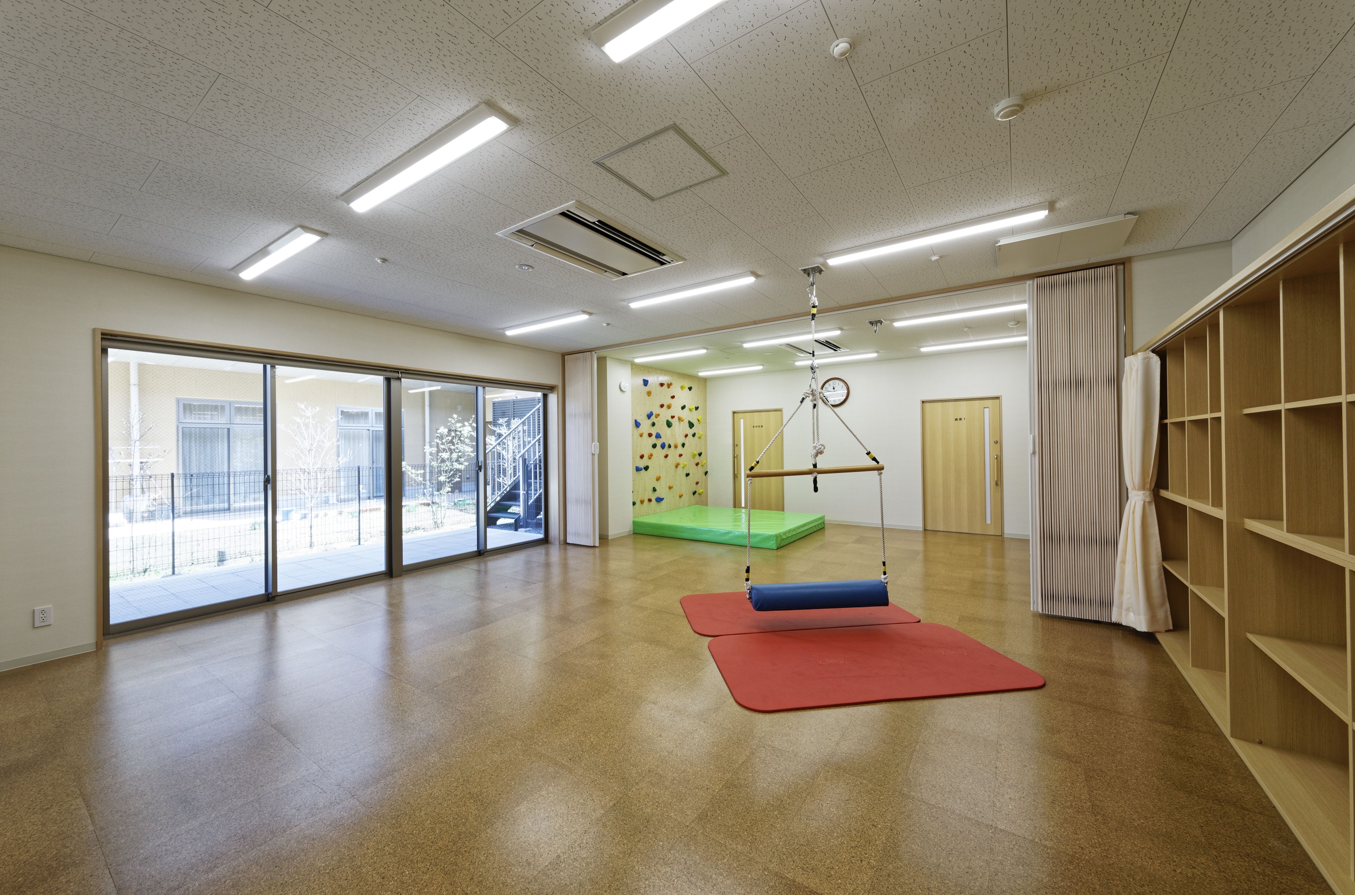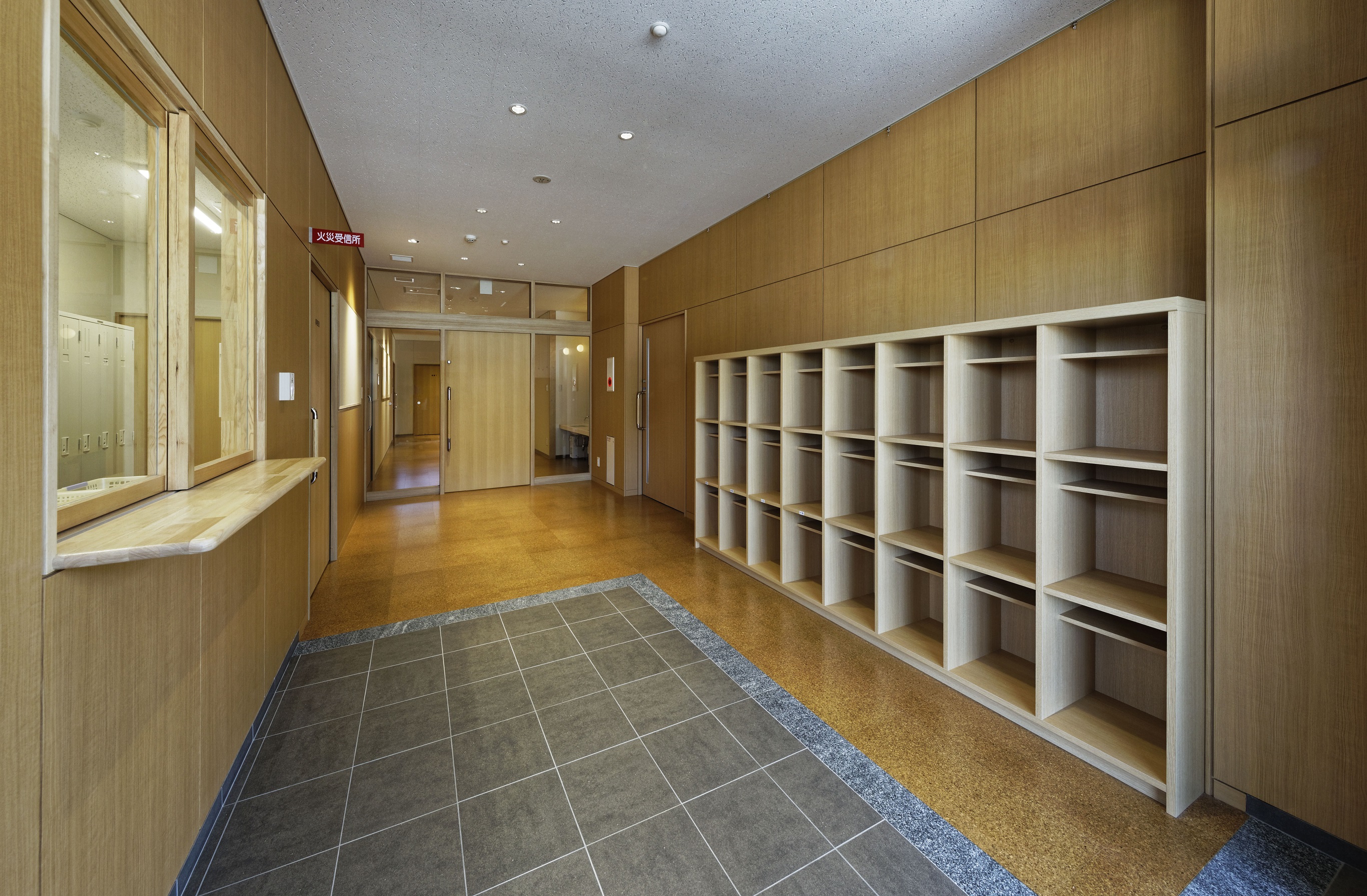 1階の学童保育は隣接する同法人の特別養護老人ホームさくらの苑のデイサービスのラウンジに面しており、将来的には相互の行き来が出来るようにして、高齢者と児童の交流を図りたい。児童向けの明るく暖かな内装に設えました。