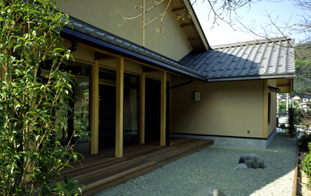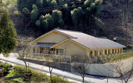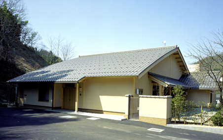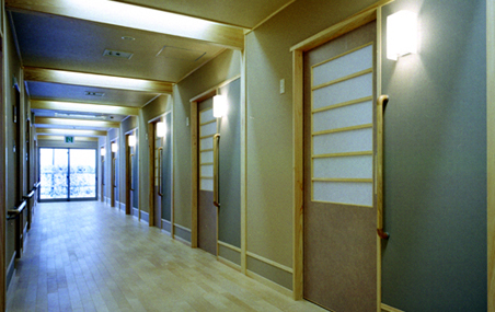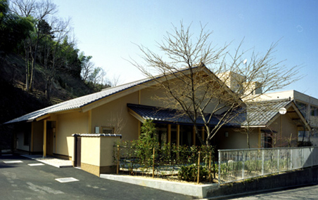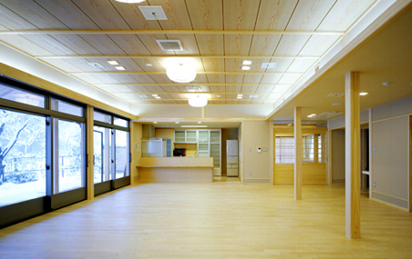 計画に当たっては、1ユニット9人のお年寄りが集まって共に生活する「大きな家」のコンセプトのもと、落ち着いた雰囲気で安心して暮らしていただくことを願い、日本の伝統的な木造平屋建ての佇まいとしています。内外部には木や砂壁調の仕上げを施し、安らぎの空間を創出しようと心掛けました。