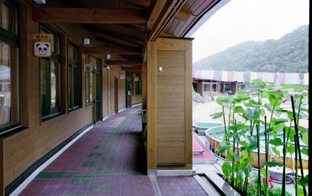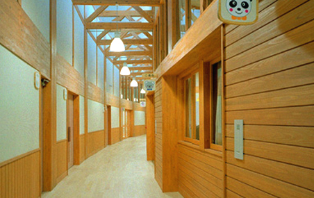 設計を始めるに際しては、0~5歳までの乳幼児が1日の大半を過ごす施設であるため、安全・快適であることはもちろんのこととして、幼い子供達のこれからの長い人生における心のふるさととしての「原風景」をつくりたいと思い、生まれ育ったふるさとのイメージを継承する、集成材や無垢材使用による木造平屋建てとしています。