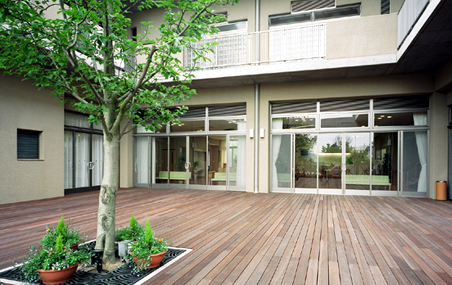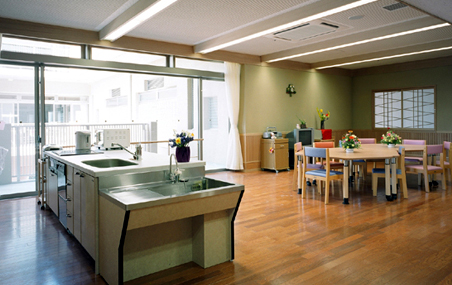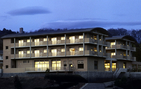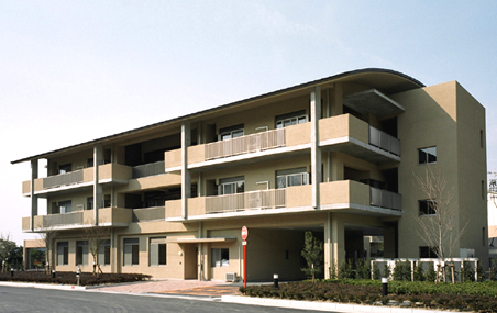 この建物は、特別養護老人ホーム(50名)、ショートステイ(10名)及びディサービスセンターを付属する老人福祉施設である。居室は10人前後のユニット計6ユニットで構成され、特養で「ユニットケア」が初めて導入された時期の施設である。ただ、制度的にはまだ過渡期にあたり、従来型の多床室が残存する特殊な施設構成となっている。