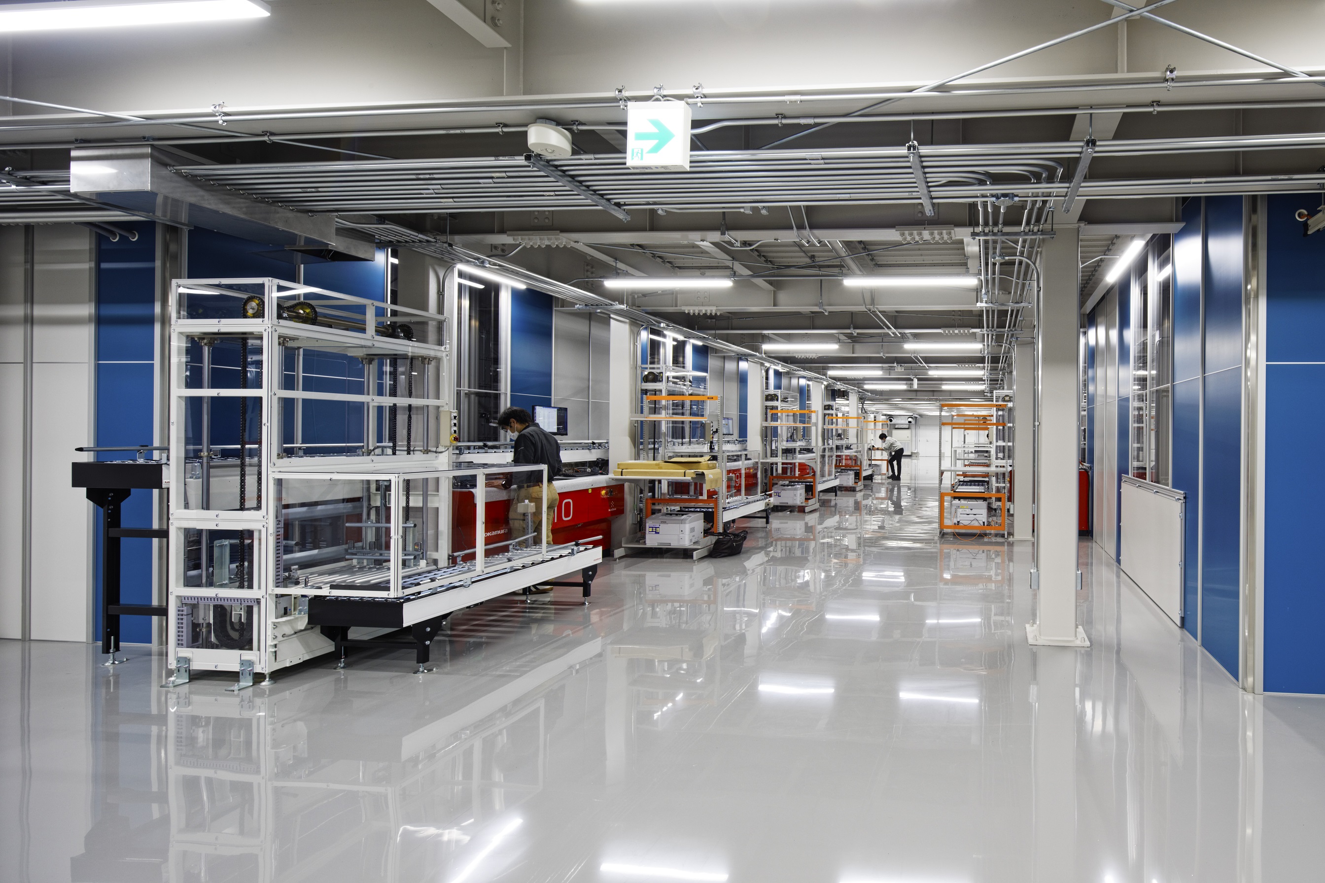 1階の物流システムは北欧のシステムを導入し国内最大級の規模になります。ピッキングは中2階を走行するロボットにより自動で行われます。平置き棚に比較して約3倍の保管能力を有し、作業効率も飛躍的にアップします。
