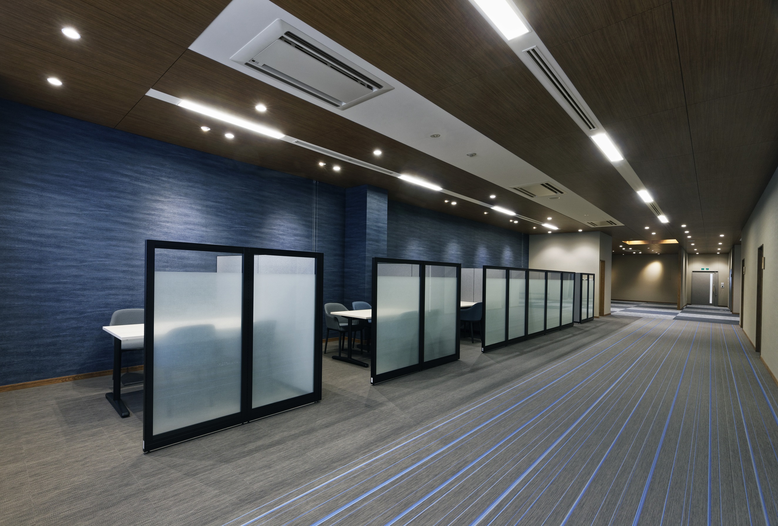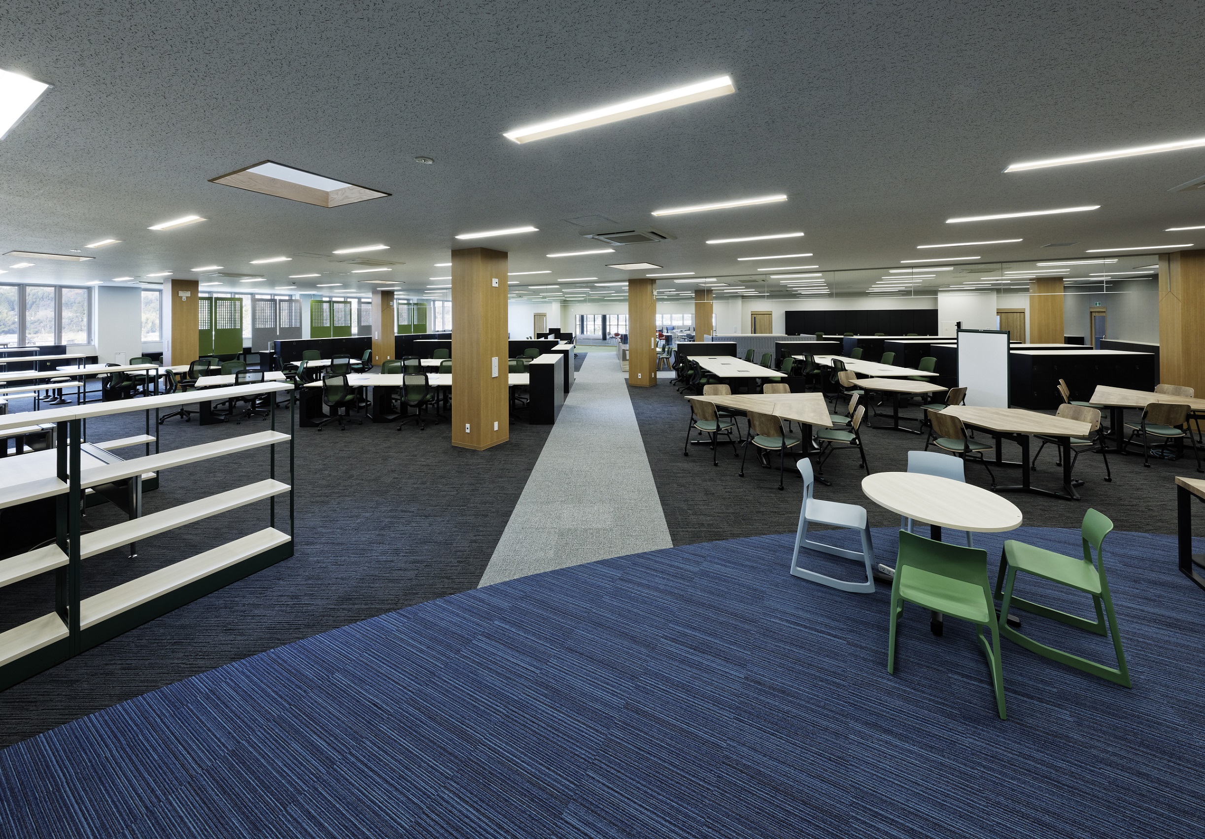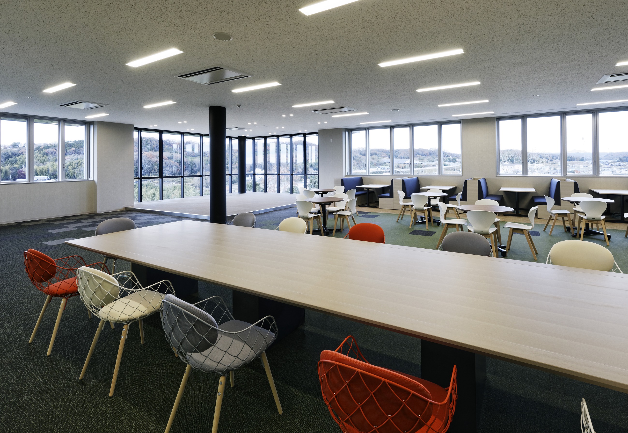 オフィスエリアはフリーアドレスを採用した空間構成を図り、オフィスや食堂フリースペースで自由に場所を選択しデスクワーク、打合せ、休憩が行えるよう工夫しました。