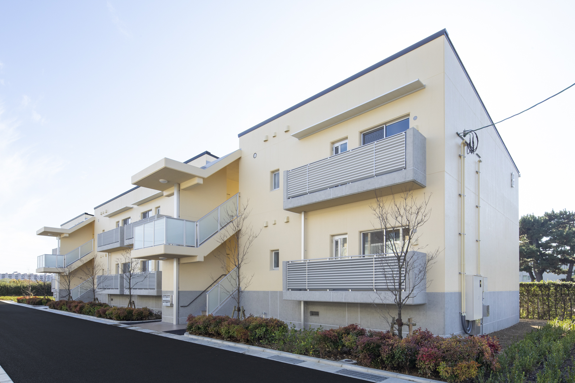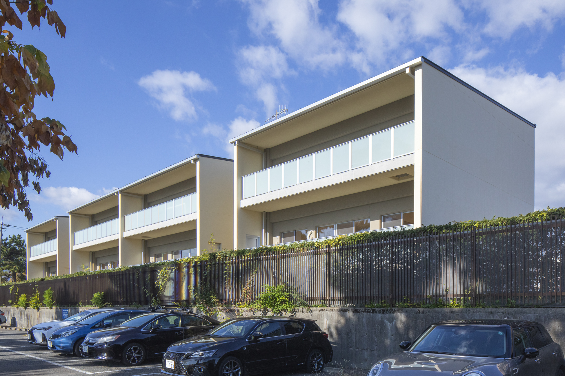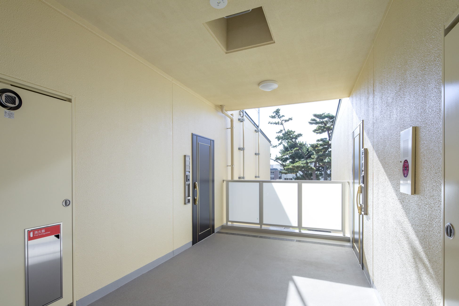 外観は隣接する既設棟との調和を図りながらも、南側バルコニー側の外壁をブラウン系の配色とする他、樋・手摺・庇材にアルミ製の部材を使用しアクセントを付けるなどして画一的なデザインとならないよう配慮しました。
