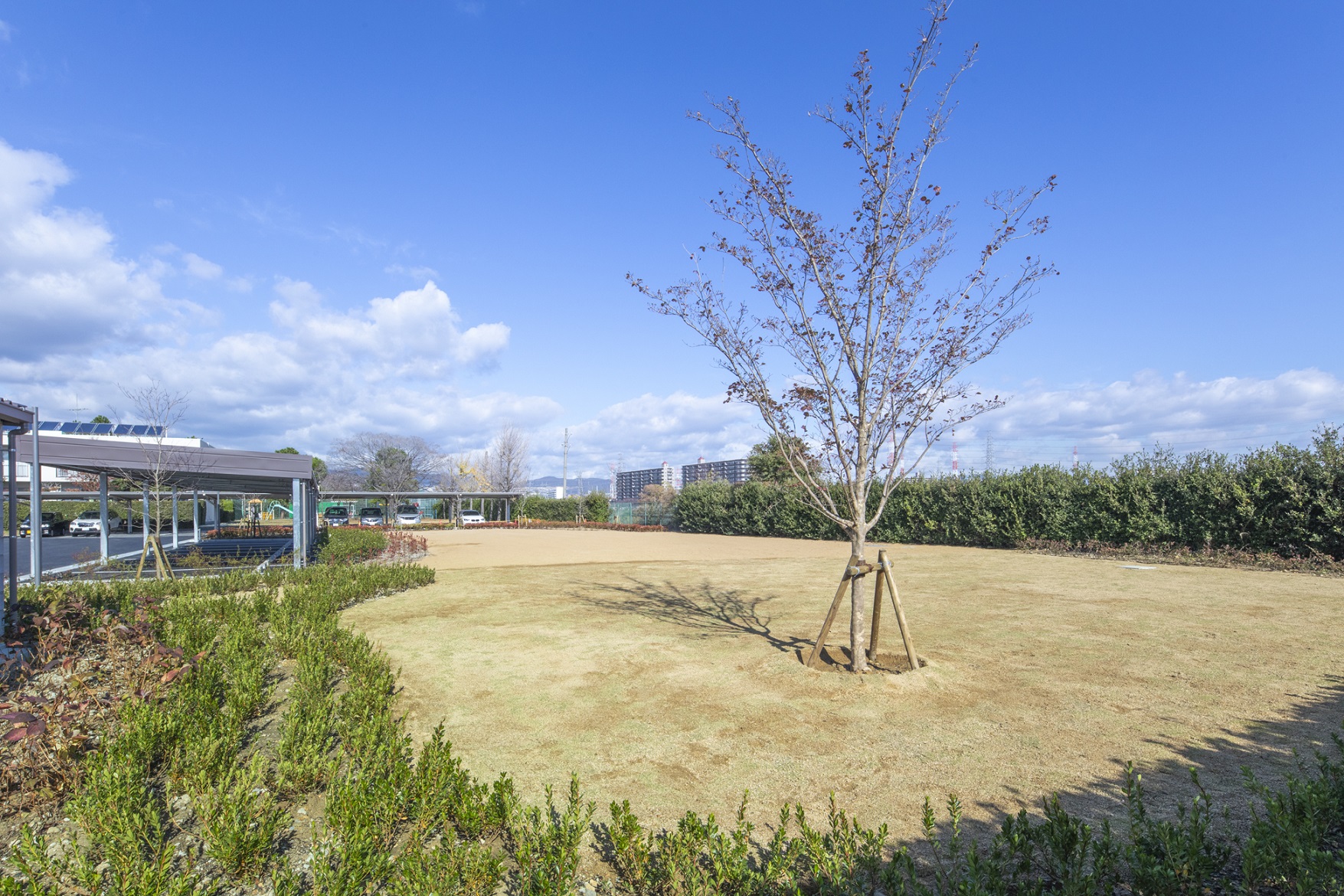 武庫川に接する敷地東側には芝生広場、ハナミズキ、アベリヤ、ユキヤナギ、サツキツツジなど多くの樹種を採用した緑地帯を設け、シンボルツリーとして春には花、夏には緑、秋には果実と紅葉が楽しめるヤマボウシを採用しました。