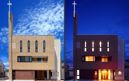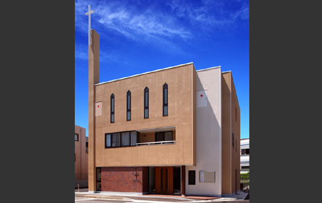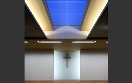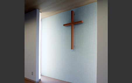 建物は法規制による高さ10m未満になり、各階の高さを抑えた計画としていますが、特に天井高さを必要とされる礼拝室は最上階に設け、トップライトから降り注ぐ自然光により視覚的な高さを確保しています。また講壇背面の壁は両袖に設けられた開口から自然光を取り入れ、ガラスモザイクタイル面に取り付けられた十字架が象徴的になるよう計画しました。礼拝室は祈りの空間であるとともに、この教会のゴスペルチームの演奏会など様々なイベントが行われることから、余分な装飾類は設けずシンプルな造形・明るい色遍いとし、様々なシーンに対応できるようにしています。また、講壇の床下には洗礼に使われる洗礼槽が設けられ、全身を水につける浸礼が礼拝室で行えるようにしています。